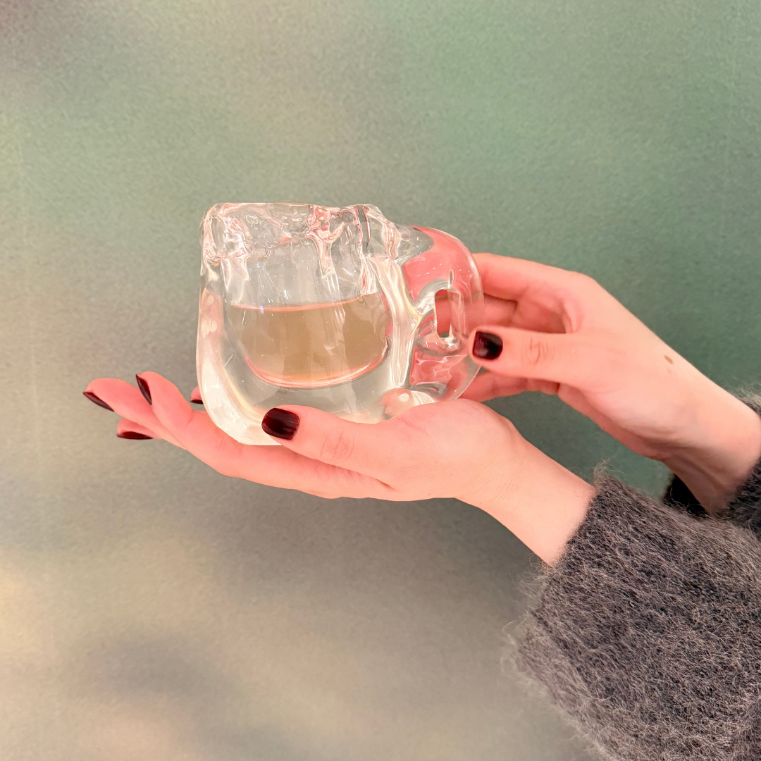 Sini Majurin lasiset kuksat ovat järkäleitä. Tahallaan. Ne painavat niin, ettei niitä voi nostaa huomaamatta. Juodessa on pakko hidastaa.