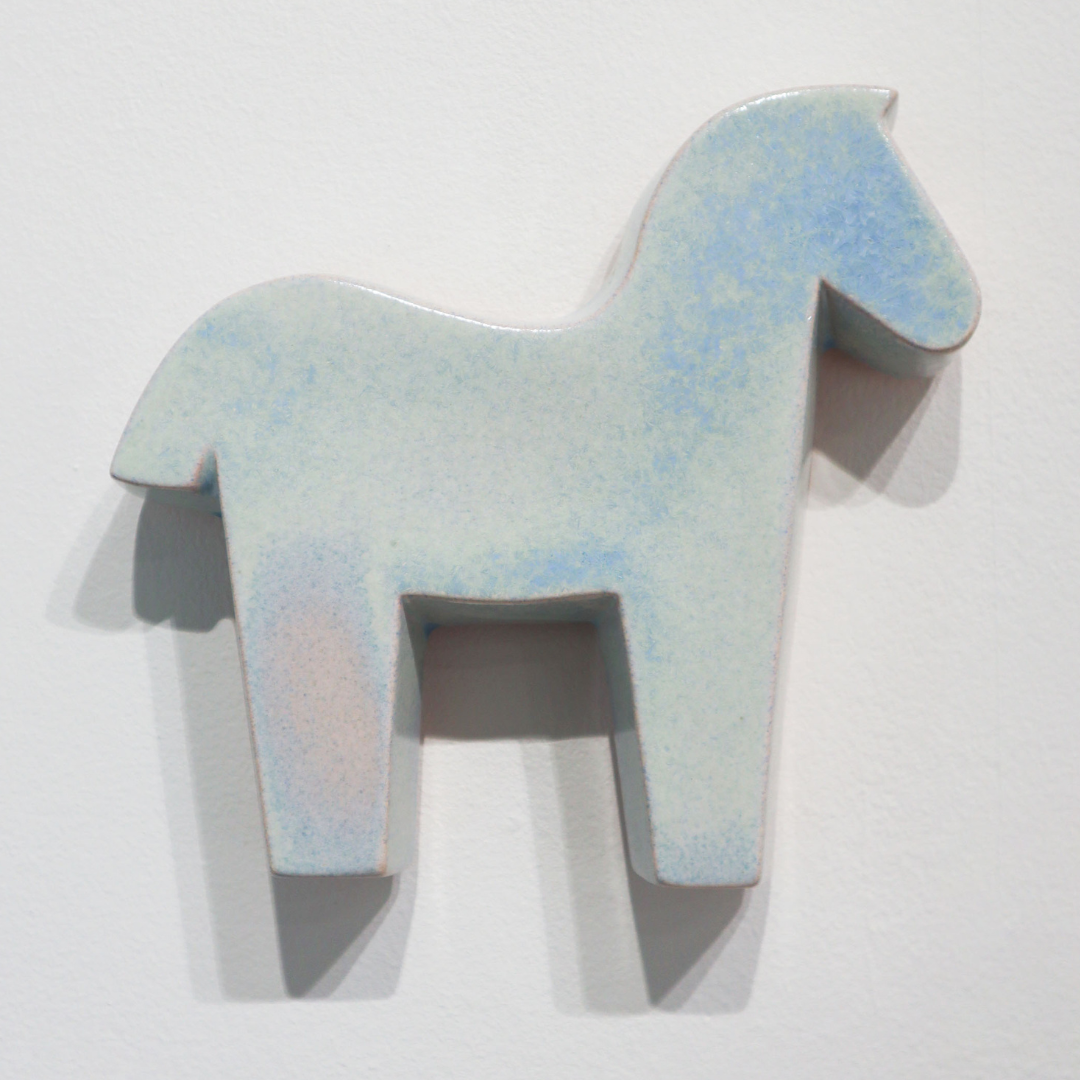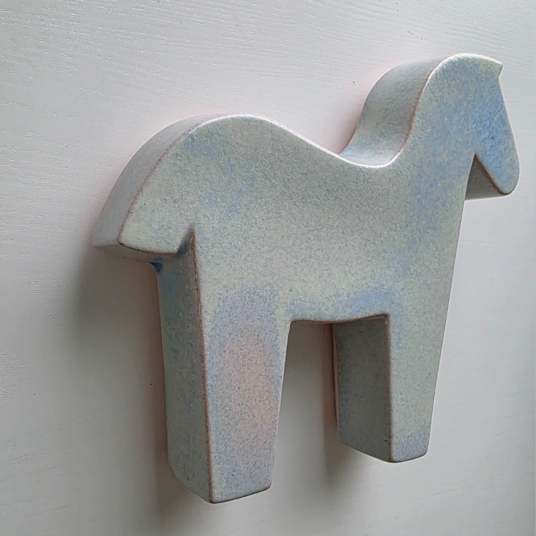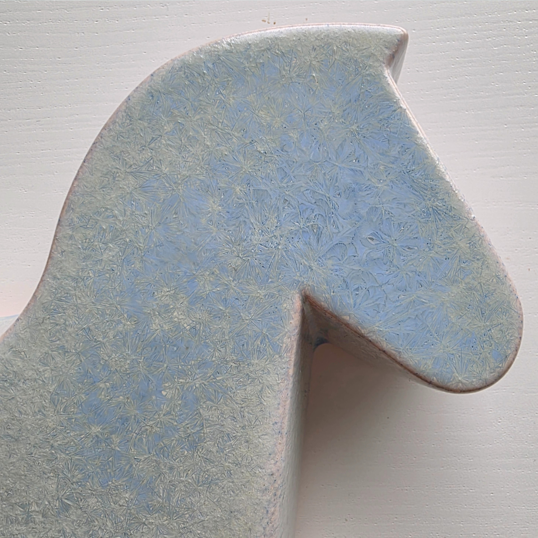 Humma Ice is a pale blue horse sculpture, glazed with a crystalline glaze resembling frost-covered flowers. The growth of the crystals in the glaze is mysterious – you can never predict exactly how they will form. At the hind leg, a subtle hint of pink from the underlying ceramic shows through, adding a lively and unexpected touch to the piece.
