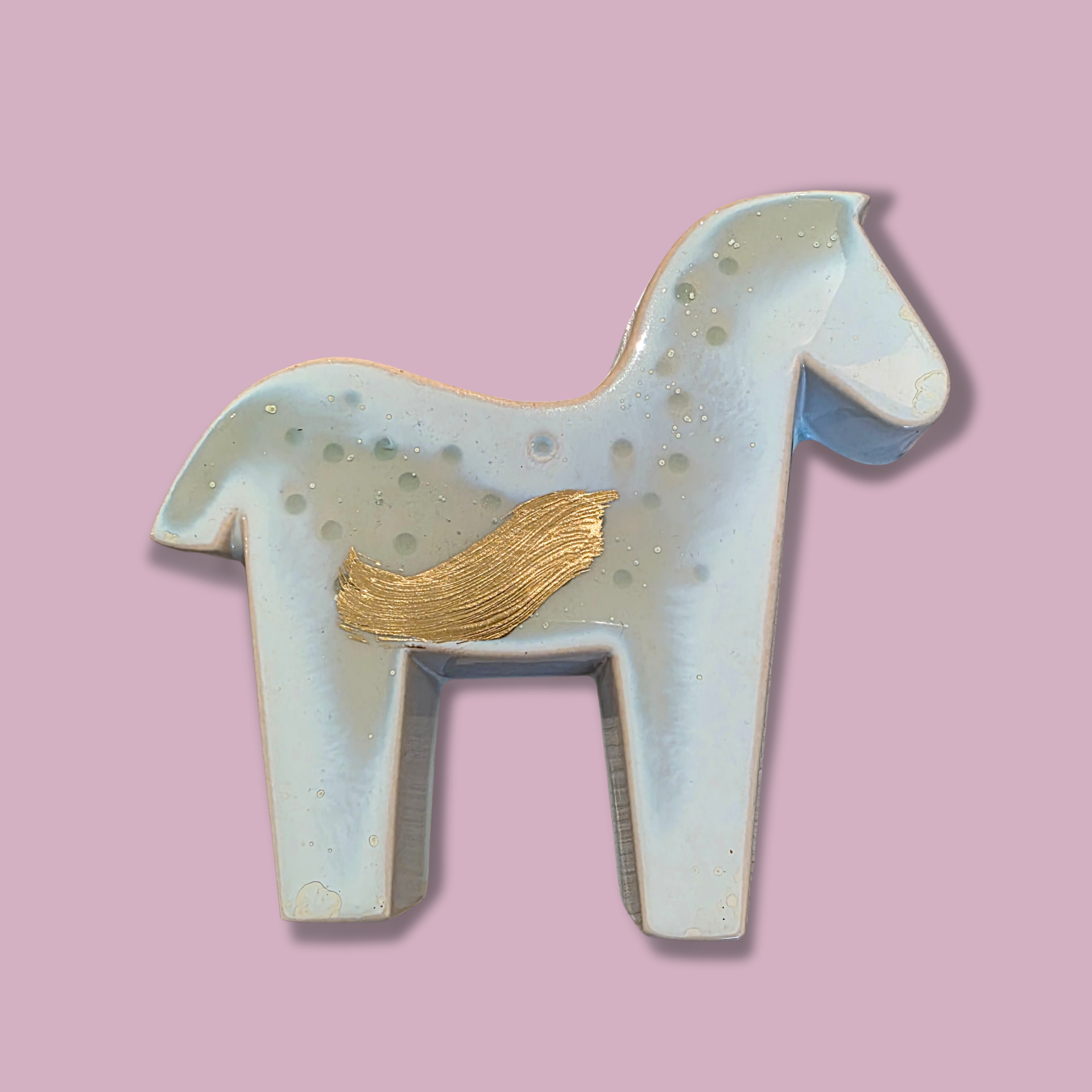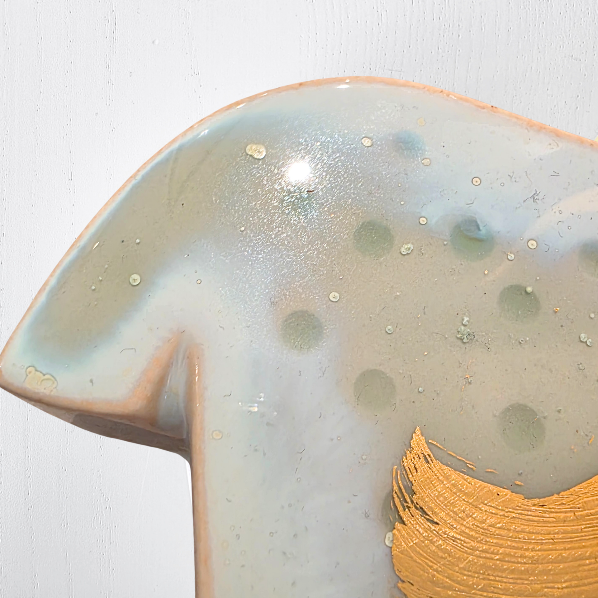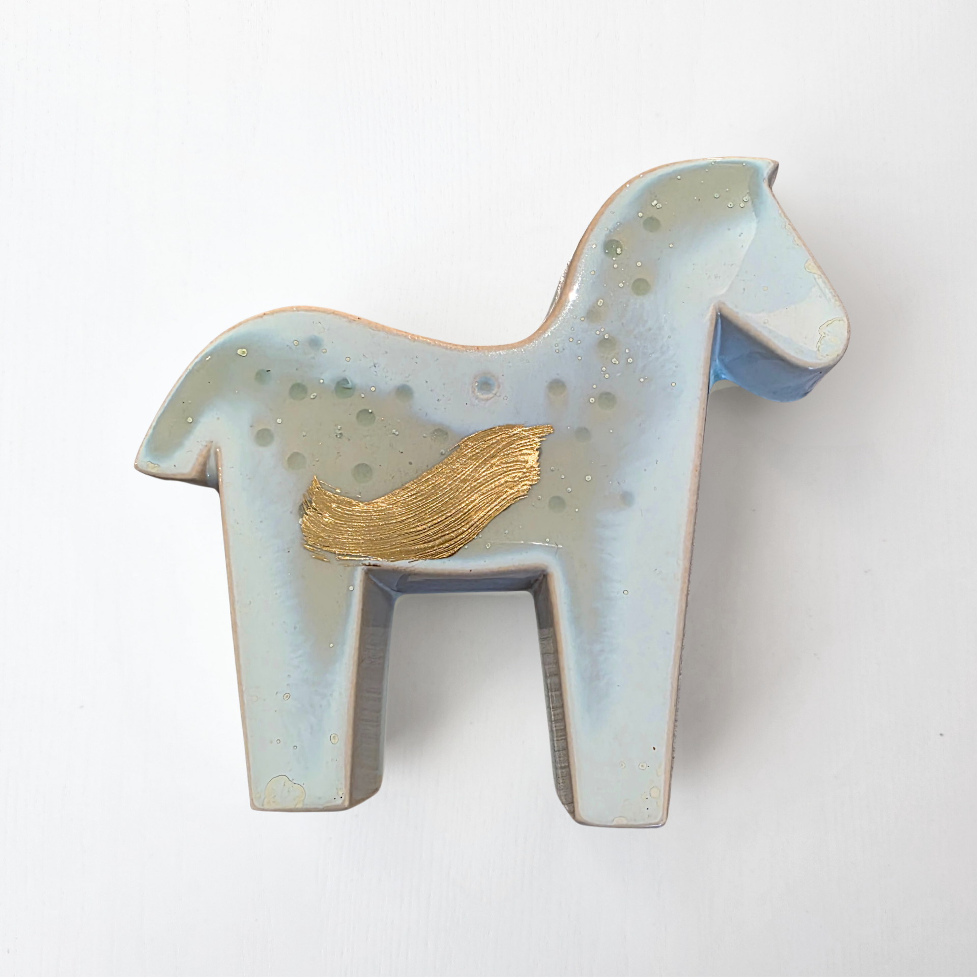 Humma Wing by Sini Majuri is a handmade ceramic wall horse. The surface is veiled in a misty grey and soft greengray glaze that settles like quiet air before rain. Across the skin, small pale crystals appear here and there like thoughts that briefly surface and fade, gentle flickers within the haze. Nothing is loud; everything hums beneath the surface.