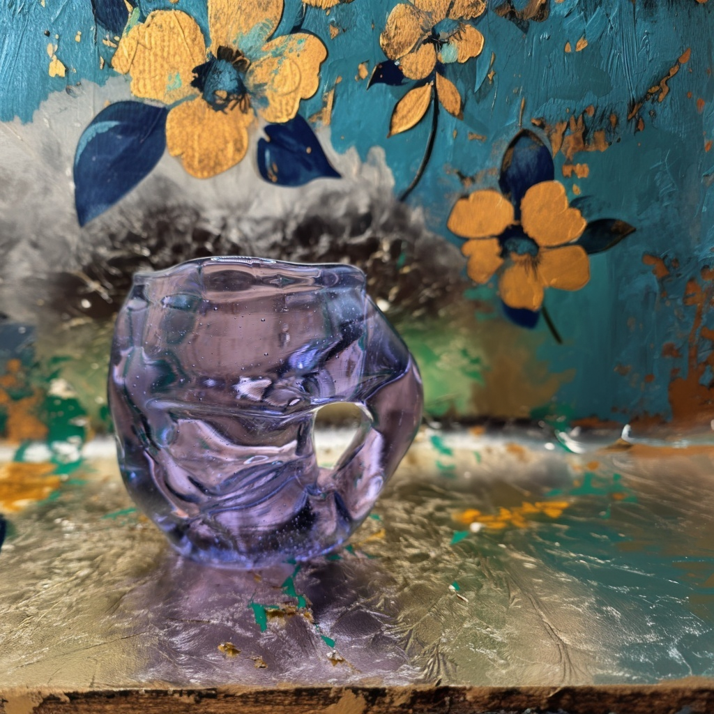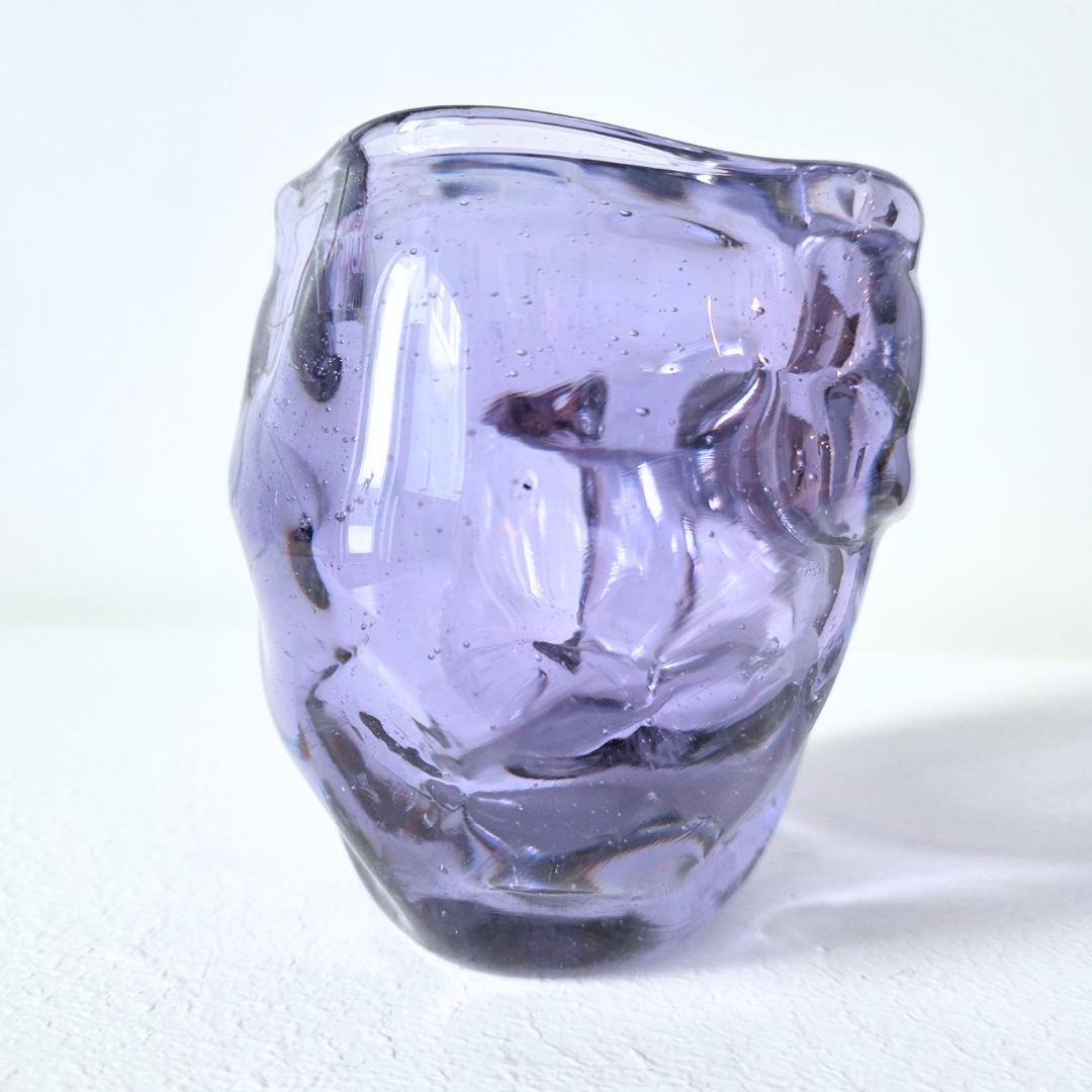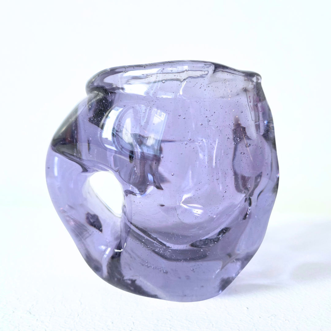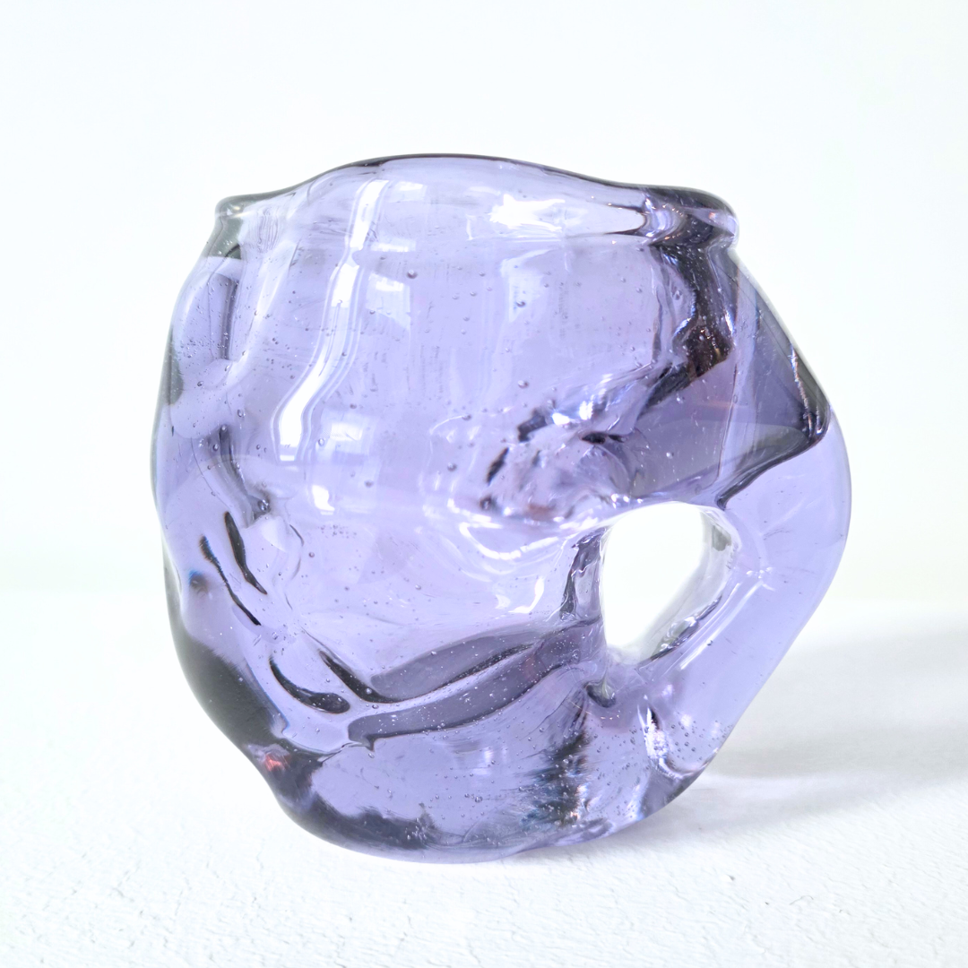 Uniikki lasiteos on veistetty yhdestä yhtenäisestä lasimöykystä, ilman liitoksia tai oikoteitä. Pelkkää massaa, joka on muuntunut astiaksi. Eri valaistuksissa se vihjailee violetin ja sinisen sävyjä, kuin iskisi silmää ja päättäisi itse, millä tuulella tänään on.