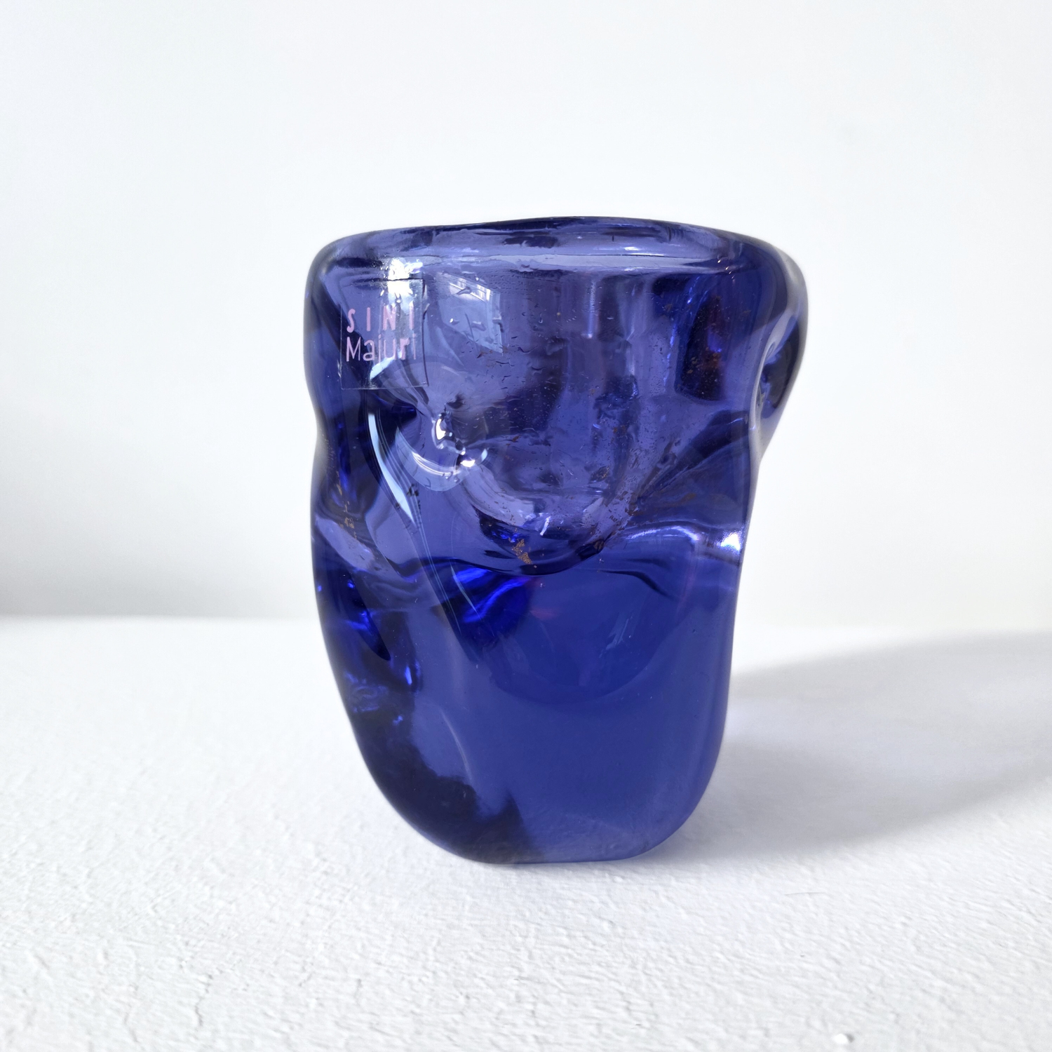 Kuksa Kultsi is a unique glass kuksa by Sini Majuri, carved from thick, dark neodymium glass. It stands 11 cm high and measures 10 × 8 cm, a chunky little slab that refuses to be hurried. It's a weight in your hand, a blunt reminder that the world does not pause for your convenience.