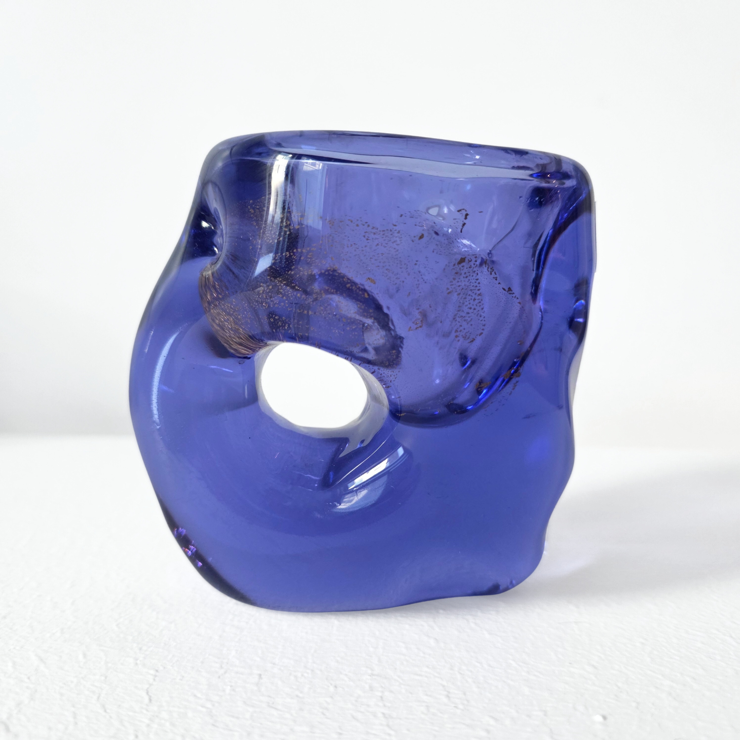 The surface is bumpy, uneven, alive with shadows that ripple like water on a dock. The dark glass shifts between blue and violet depending on the light, like your thoughts right before you realize you're late for everything that matters. Inside hides a single leaf of genuine Lapland gold, visible only to those who stop and really look. It's not decoration; it's a secret with a sly sense of humor, quietly mocking your inattention.