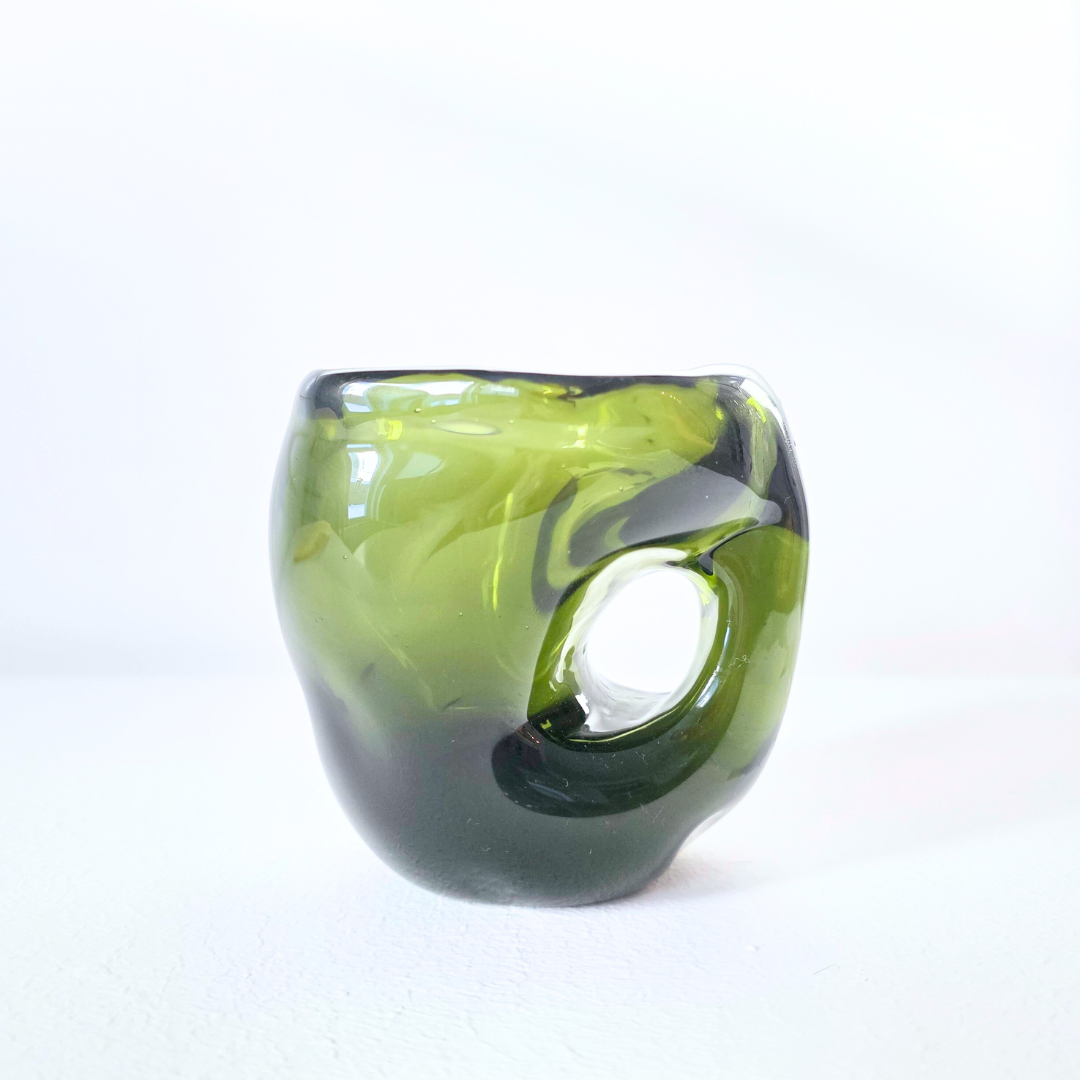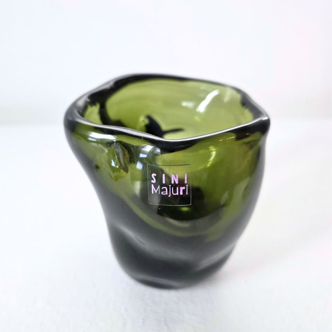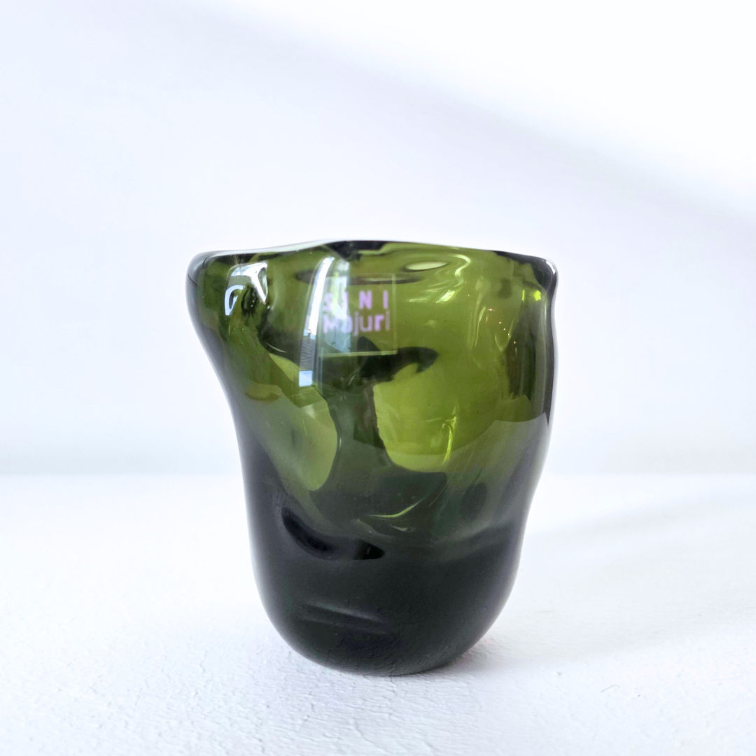 Kuksa Siimes on massiivinen, uniikki ja painava lasiesine, tehty syvän oliivinvihreästä lasista. Sen möhkämäinen, runsas muoto tuo läsnäoloa, koska siitä ei voi juoda ilman pysähtymistä. Samalla lasin syvä sävy vangitsee valon ja luo heijastuksiin sävyjen leikkiä. Teos on kuin hiljainen hetki luonnon siimeksessä; vakaa, voimakas ja meditatiivinen, kutsuen katsomaan ja koskettamaan.
