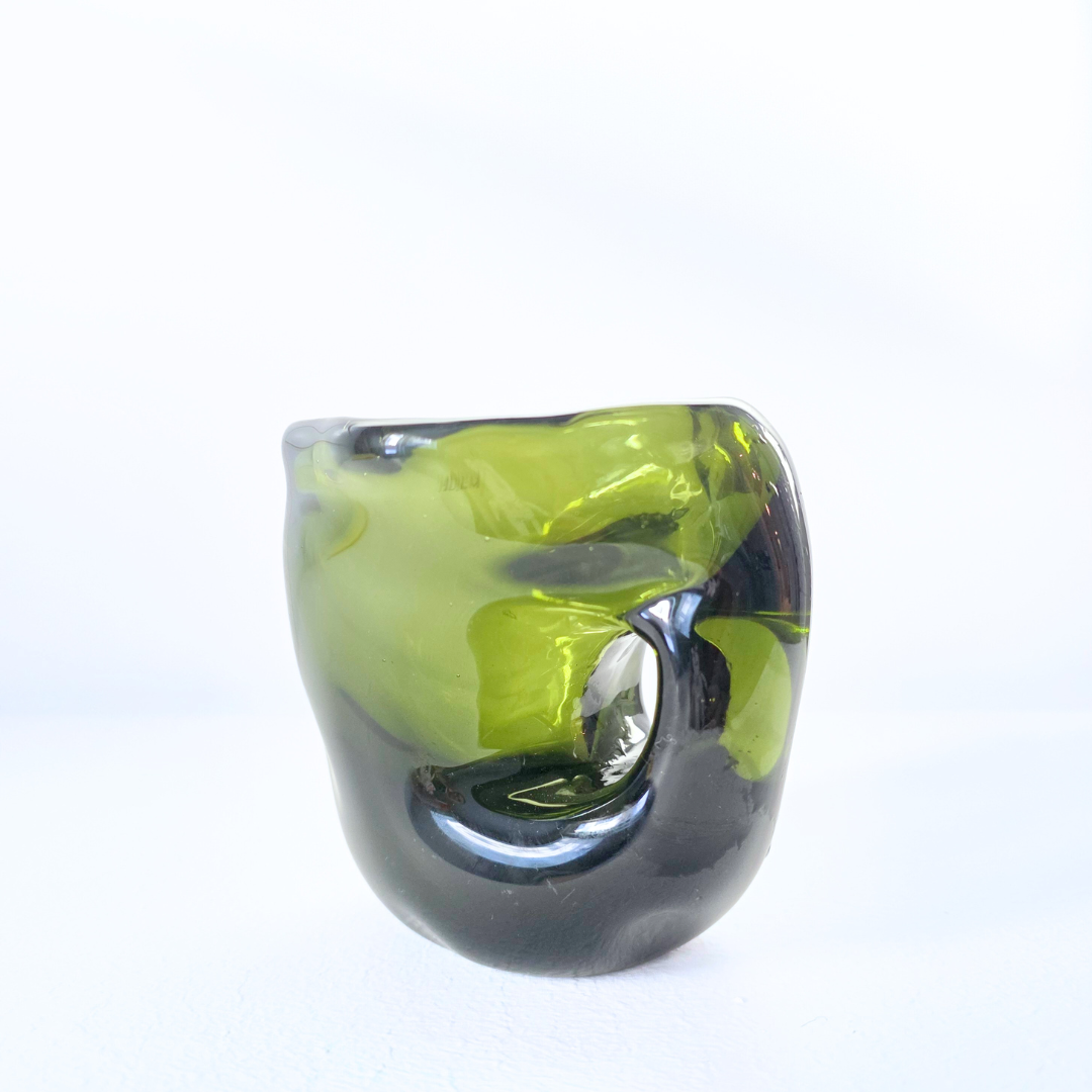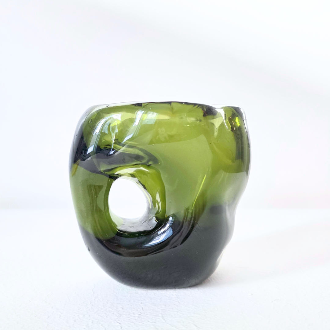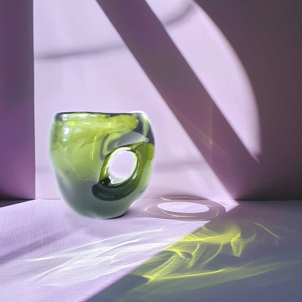Kuksa Siimes on massiivinen, uniikki ja painava lasiesine, tehty syvän oliivinvihreästä lasista. Sen möhkämäinen, runsas muoto tuo läsnäoloa, koska siitä ei voi juoda ilman pysähtymistä. Samalla lasin syvä sävy vangitsee valon ja luo heijastuksiin sävyjen leikkiä. Teos on kuin hiljainen hetki luonnon siimeksessä; vakaa, voimakas ja meditatiivinen, kutsuen katsomaan ja koskettamaan.