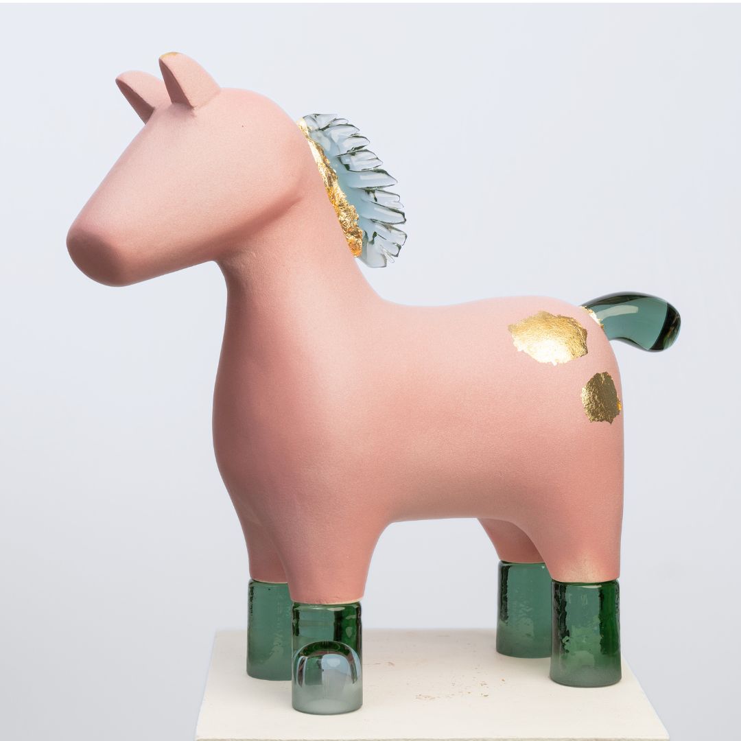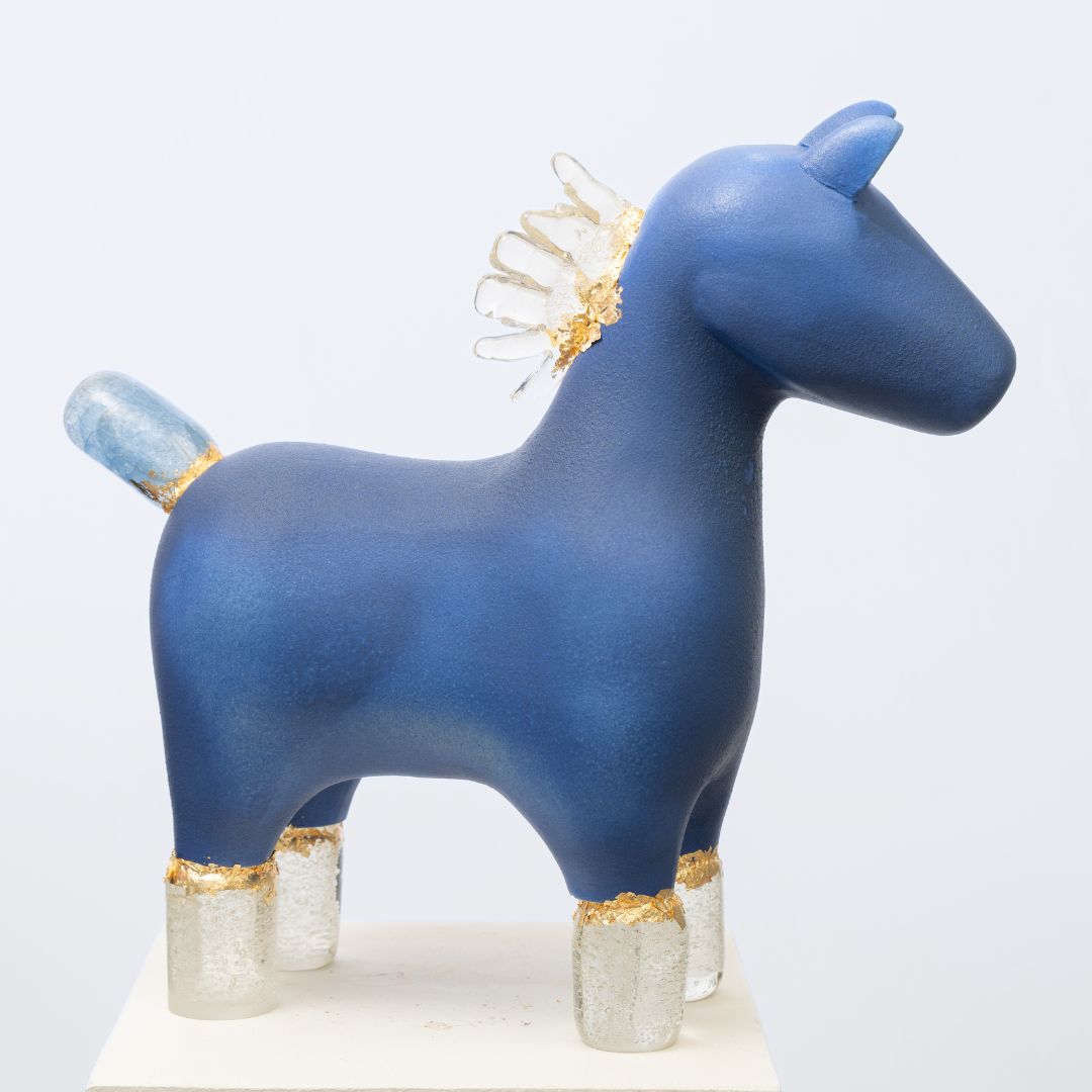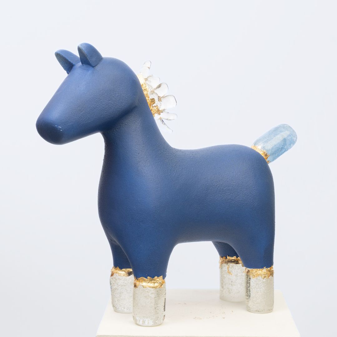 Keramiikka muotoillaan hitaasti, antaen värien asettua pinnalle kerros kerrokselta. Käsinpuhallettu lasi luo sisäisen horisontin, viileän ja tasaisen hehkun. Yhdessä ne muodostavat veistoksen, joka on yhtä aikaa maanläheinen ja kevyesti loistava, kuin rannan hiekasta löytynyt esine pitkän nousuveden jälkeen.