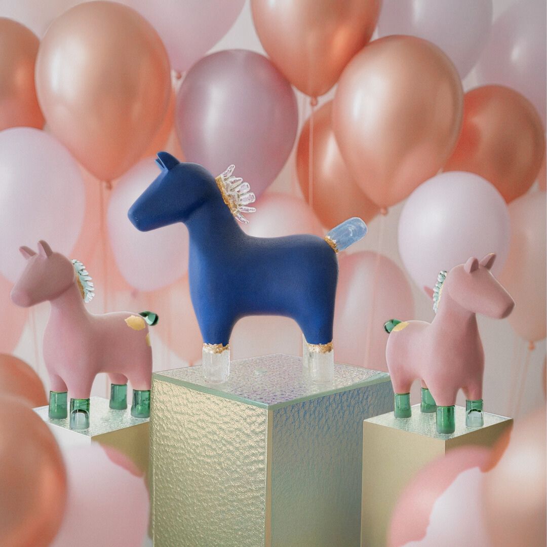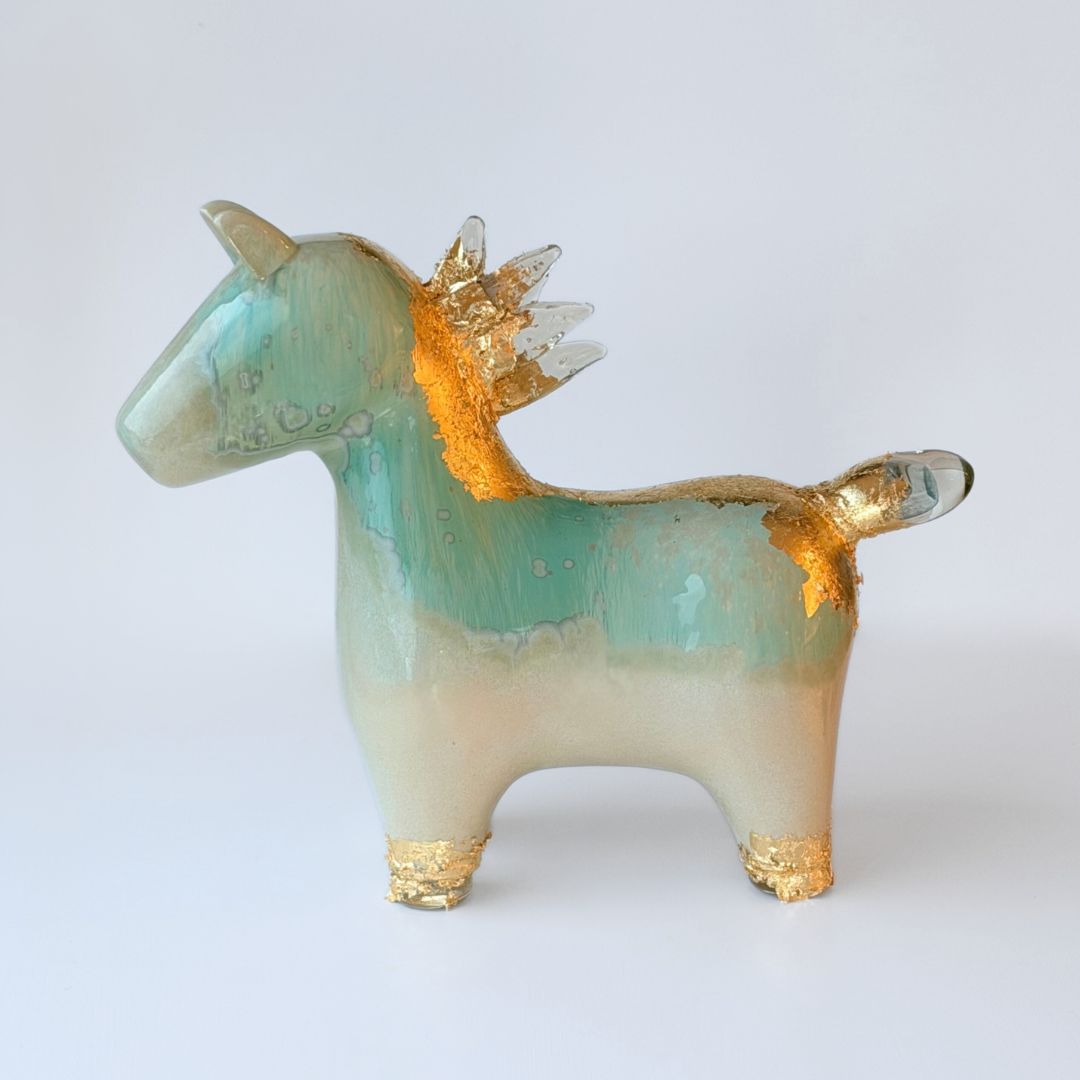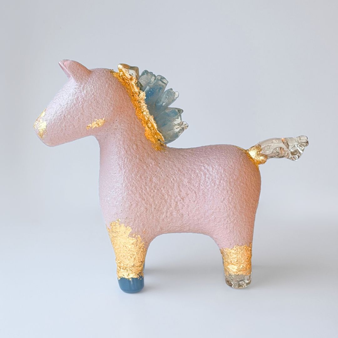 Keramiikka muotoillaan hitaasti, antaen värien asettua pinnalle kerros kerrokselta. Käsinpuhallettu lasi luo sisäisen horisontin, viileän ja tasaisen hehkun. Yhdessä ne muodostavat veistoksen, joka on yhtä aikaa maanläheinen ja kevyesti loistava, kuin rannan hiekasta löytynyt esine pitkän nousuveden jälkeen.